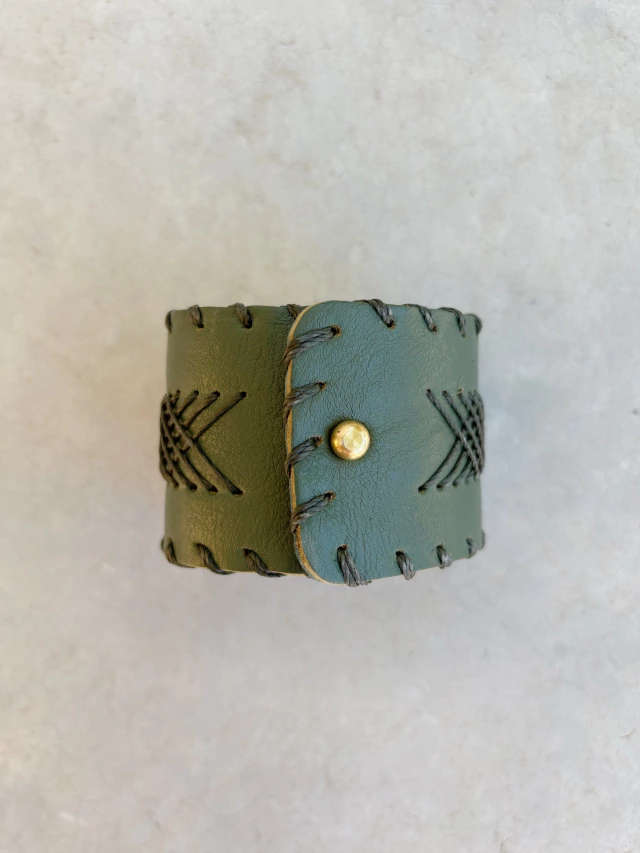 Hecha en cuero natural y forrada para mayor suavidad, esta pulsera combina textura, color y oficio.